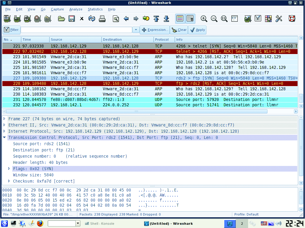 After running Nmap, we can start to envision how an attack against our network might take place. Assume we can glean our network's external IPs from public DNS or whois records. With this information, we run a network map against those IP addresses and identify host OS and application versions. With map results in hand, we scan said hosts for vulnerabilities as discussed in section 3 of this article. If we are lucky, we find one and run an exploit against it to take control of the box. If all we wanted was to own the box, mission accomplished. But, if we wanted to own other hosts or the network, we might begin a new map from the inside or sniff with a tool like Wireshark from the owned box. If we passively sniff traffic instead of map, we are less likely to set off any IDS alarms. At that point, we notice SSH traffic to a particular machine, so we attempt to gain a remote shell against it. Hopefully, there aren't any glaring openings in our local configuration, as we checked for in section 1, or we might lose another box or boxes.