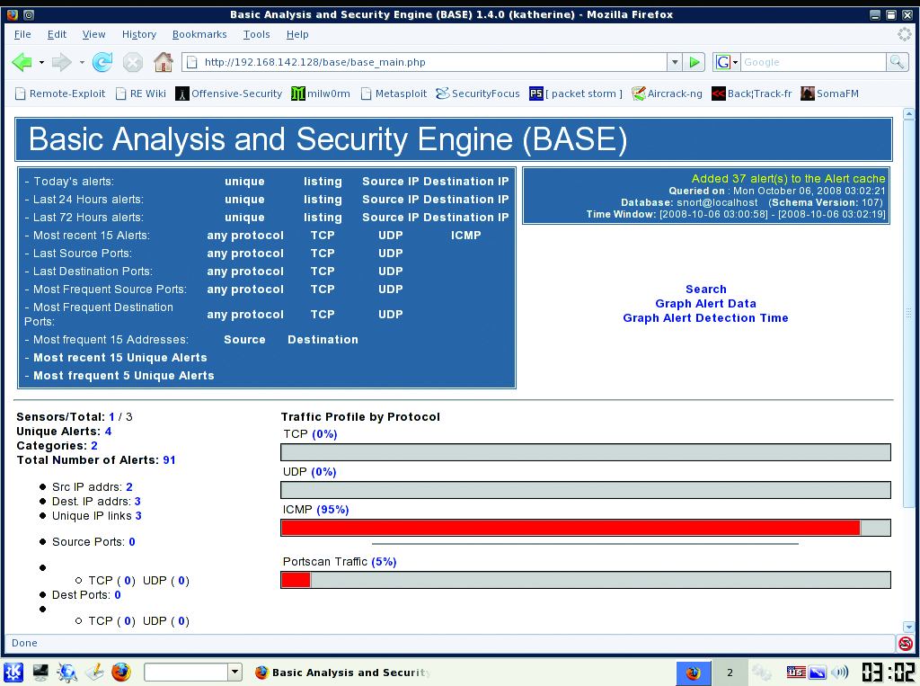 The BackTrack team conveniently has packaged Snort with the BASE Web front end in the distribution. From the KDE menu, select Services→Snort→Setup and Initialize Snort. You will be prompted by the setup script to enter root and Snort user passwords for MySQL in order to create the needed tables. At the end of the script, open a Web browser and enter http://youripaddress/base/base_db_setup.ph, and on the page that loads, click on the Create Base AG button. Now, click on the Main Page link (Figure 4) to access alert information. Unlike Wireshark, Snort should be run over a longer period of time (more than 24 hours in most cases) to provide a good sampling of network data.