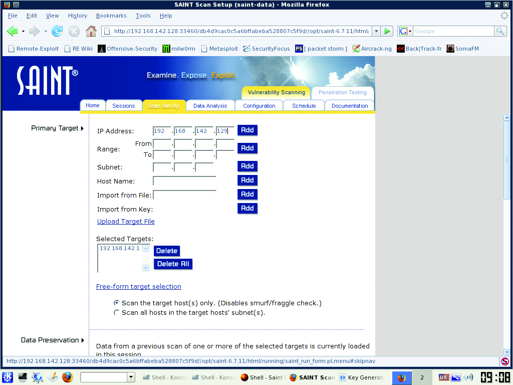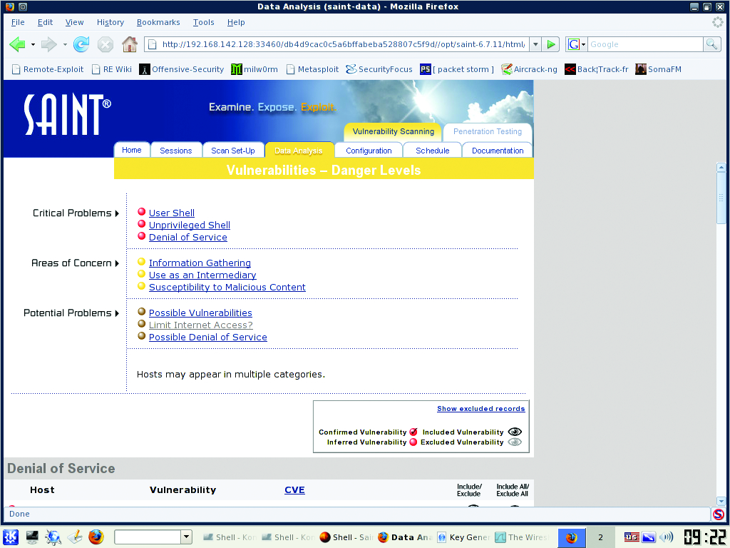 SAINT normally allows only two IP addresses for scanning for 15 days, but BackTrack users can use up to ten IP addresses for up to a year by using the registration page found under the KDE menu: BackTrack→Vulnerability Identification→SAINT Exploit→SAINT Exploit License. From this Web page, click the Get License button at the bottom of the page and provide the necessary information on the registration page. Proceed with registration, and generate a key for use with the scanner. Once the key has been entered on the VM, launch SAINT from the same KDE folder as the License link, but click on the SAINT link instead. This launches the Web front end. Click the Scan Set-Up tab. Enter the IP addresses or range you want to scan (Figure 5). Under the Scanning Level section, check off Exhaustive and Full Port Scan. In the Firewall section, select No Firewall Support. You can play with any of these options to tailor the scans to your needs. Click Scan Now at the bottom of the page when finished. The results are displayed when the scan is finished (Figure 6). You should review and document the scan results, and wherever possible, remediate discovered vulnerabilities.