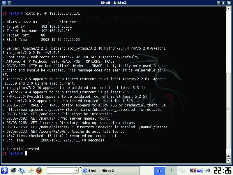 This broad scan with SAINT should be followed up with more specific scans against your most valuable (and therefore juicier targets) machines. As an example, let's scan a Web server using another tool found on BackTrack, Nikto. Nikto is a mature, simple scanning tool and an excellent resource for locking down a Web server. Assuming you have a Web server in your environment, launch a Nikto shell from the VM under the KDE menu BackTrack→Penetration→All→Nikto2, and from the resulting shell, type: