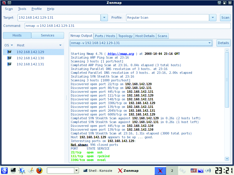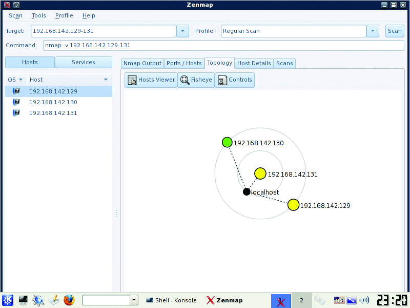 Although Nmap is on the BackTrack VM, you need to update to the latest version to use the handy new topology tab of the zenmap front-end GUI. Download Nmap from the project's site, and install on the VM with the usual ./configure, make, make installsequence. Type the command zenmap from a terminal to bring up the GUI. Enter a host, host range or network as the target, select Regular Scan from the Profile drop-down list and click on Scan. This performs a cursory scan of the host/networks and identifies open ports and other available information about the host, such as OS and app versions (Figures 8 and 9). Be patient; this process may take a while. Use Nmap's results to verify that only allowed hosts and services are accessible from the outside.
